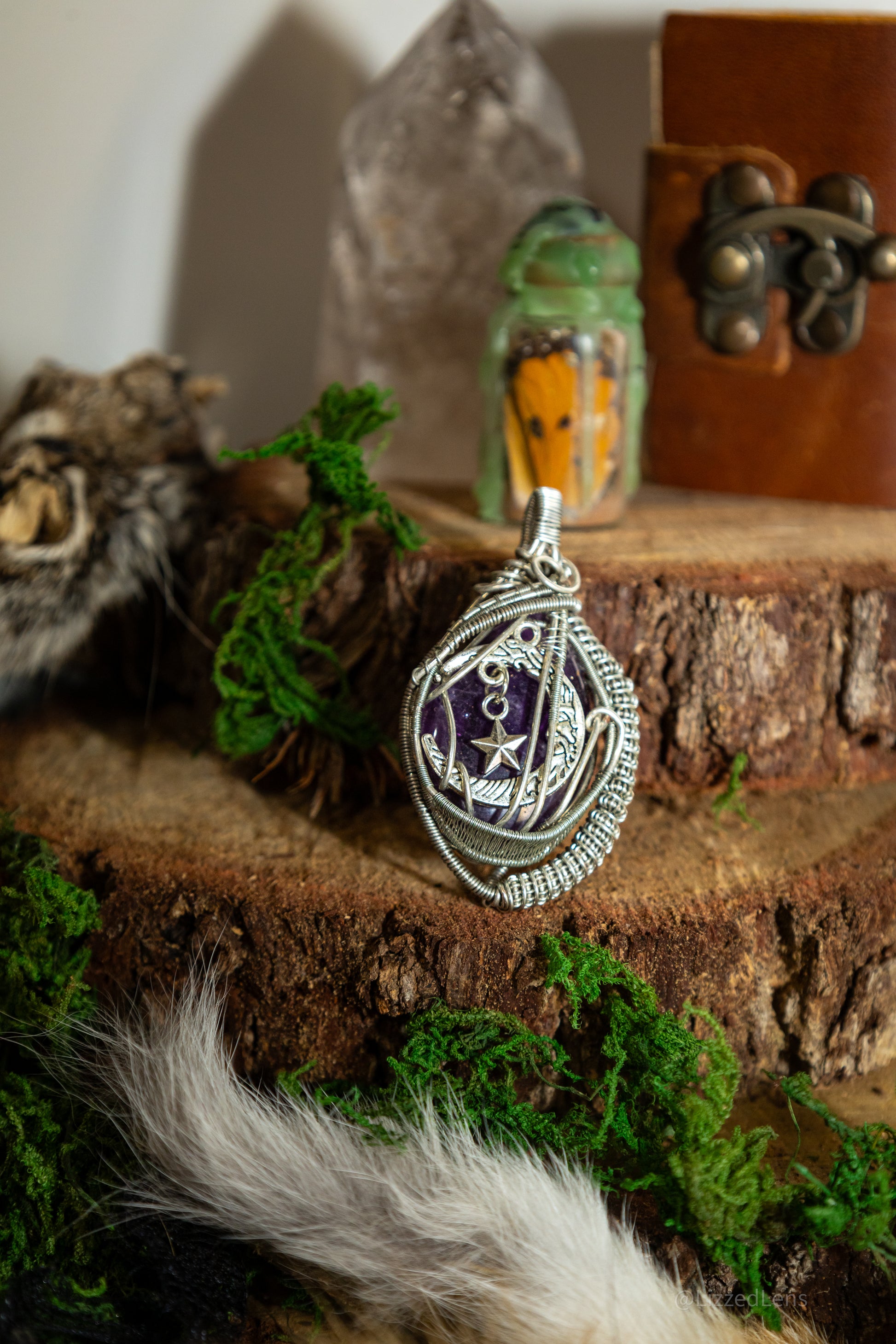 Connect with your divine intuition with this celestial Amethyst Moon Pendant. Featuring a Crecent moon and star charm, Amethyst , carefully cradled in hand-twisted silver-plated copper wire, this piece embodies both mystery and clarity. It’s perfect for moon lovers, mystics, and anyone walking a path of spiritual growth.